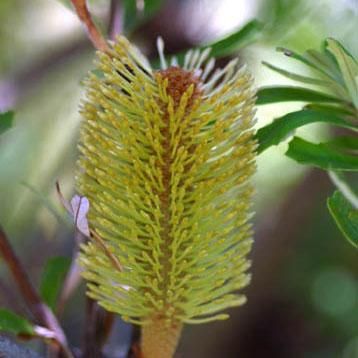 - 個性的な樹形: 真っ直ぐシャキーンと伸びる感じがなく、1本1本の枝や幹の曲がりがあって、形の面白いバンクシアです。