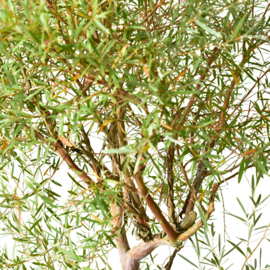 細長くシルバーがかった葉と、枝垂れるように伸びるやさしい樹形が特徴。春には白く小さな花を咲かせます。