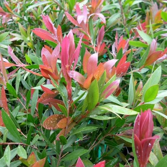 ・新芽は目を惹く鮮やかな赤色。花のない時期もカラーリーフとして楽しめる