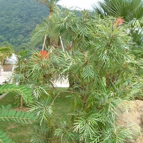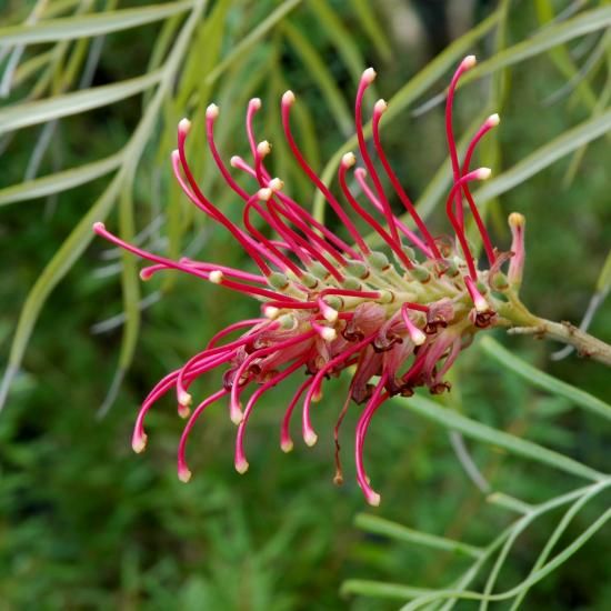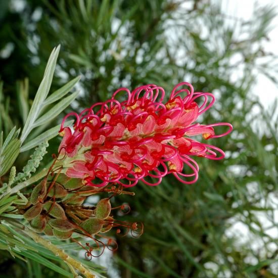 他にない存在感。グレヴィレア バンクシー、あなたの庭の主役に。繊細で柔らかな葉と、ダイナミックな花のコントラストが魅力の「グレヴィレア バンクシー」。