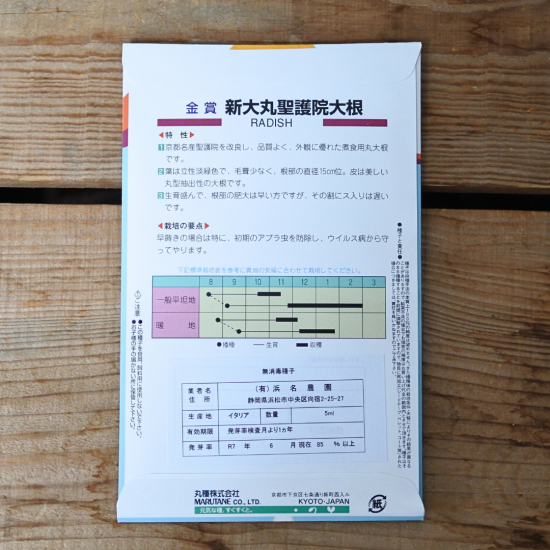 「新聖護院大根(しんしょうごいんだいこん)」は、一般的な青首に比べて丸い形が特徴。緻密でやわらかな肉質で煮崩れしにくく、辛味が少なく甘みが出やすいため、だしを含ませる煮物やおでん、風呂吹き大根、田楽に最適です。ス入りが遅いので収穫の幅がとりやすく、家庭菜園でも扱いやすい品種です。