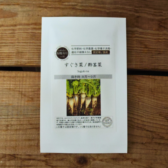 京都三大漬物「すぐき漬け」に使われる伝統のカブ、すぐき菜。有機栽培された固定種・国産の安心タネです。根は約20cmとコンパクトで育てやすく、初心者の方にもおすすめ。
